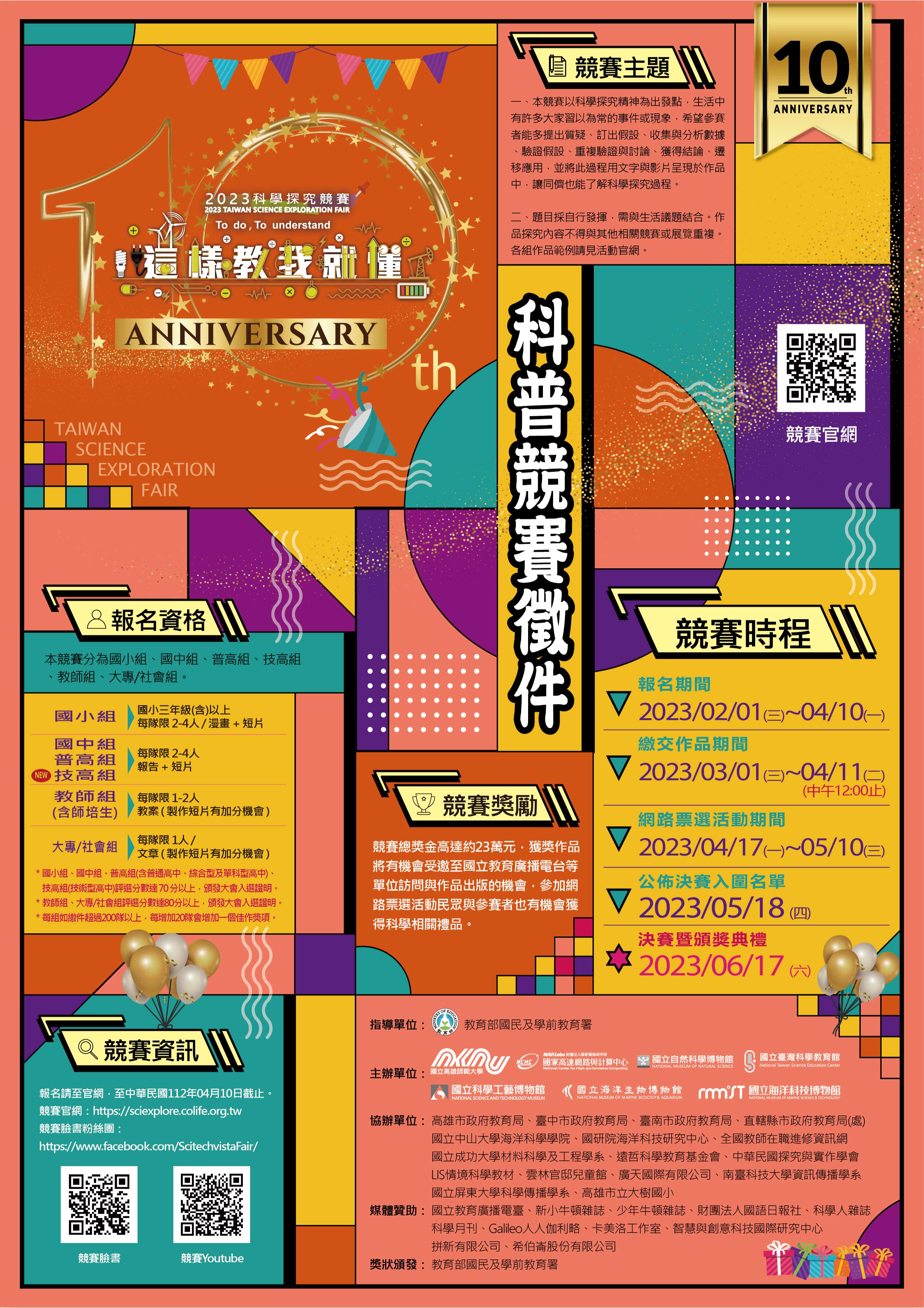 二、旨揭競賽由教育部國民及學前教育署及科技部國家實驗研 究院指導,並由國立高雄師範大學、國研院國網中心、國 立自然科學博物館、國立臺灣科學教育館、國立科學工藝 博物館、國立海洋生物博物館及國立海洋科技博物館共同 辦理,邀請對科學有興趣之師生,透過科學問題發想、資 料收集與理解、探究及表達,以科學的角度解答來解決生 活議題,培養科學敘事能力。