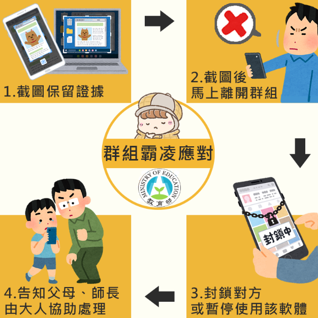 遭遇網路霸凌時,或任何網路上的不當行為,務必要 截圖或錄影存證,存證的內容不僅僅是涉及霸凌的訊息本身,還包含明 確網址、霸凌者的資訊(如帳號、ID、社群平台上的公開資訊等)、發生的 時間點等,蒐集的資訊越完整,對於後續的處理就會越有幫助。