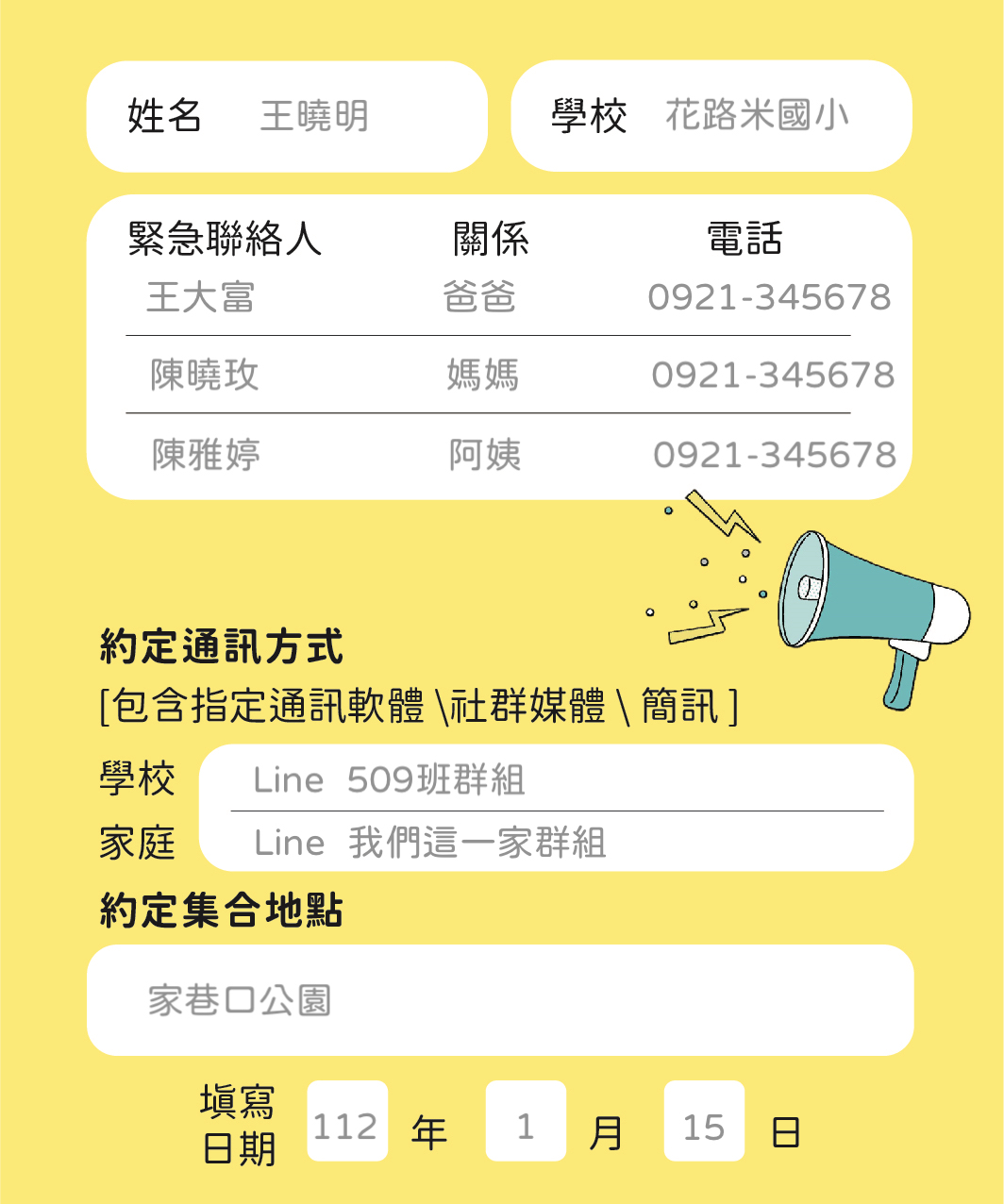 (2)家庭欄位:學生本人在災害發生時聯繫家長之約定通訊方式,如網路暢通時,可採用通訊軟體;如網路不暢通時,可採簡訊等方式聯繫。約定集合場所(地點)以因應地震災害為主,得依在地化災害特性填寫或增列。