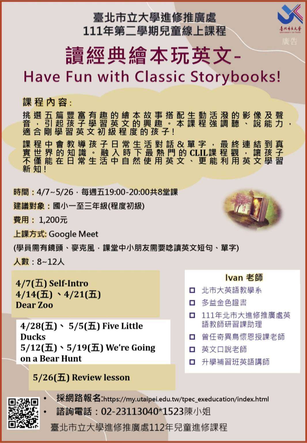 (五)網路報名:請至本處報名網頁報名https://my.utaipei.edu.tw/tpec_exeducation/index.html,點選左欄: 112-春-讀經典繪本玩英文。