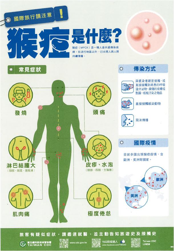 三、疑似猴痘感染症狀,如:出現不同型態的皮膚病灶 (如:皮疹、斑疹、斑丘疹、水泡、膿疱等,於臉部、 四肢及生殖器等部位),可能伴隨症狀,如:發燒 (≥38°C)、畏寒/寒顫、出汗、頭痛、肌肉痛、背 痛、淋巴腺腫大(如耳周、腋窩、頸部或腹股溝等 處),如有相關症狀,請佩戴口罩並就醫。