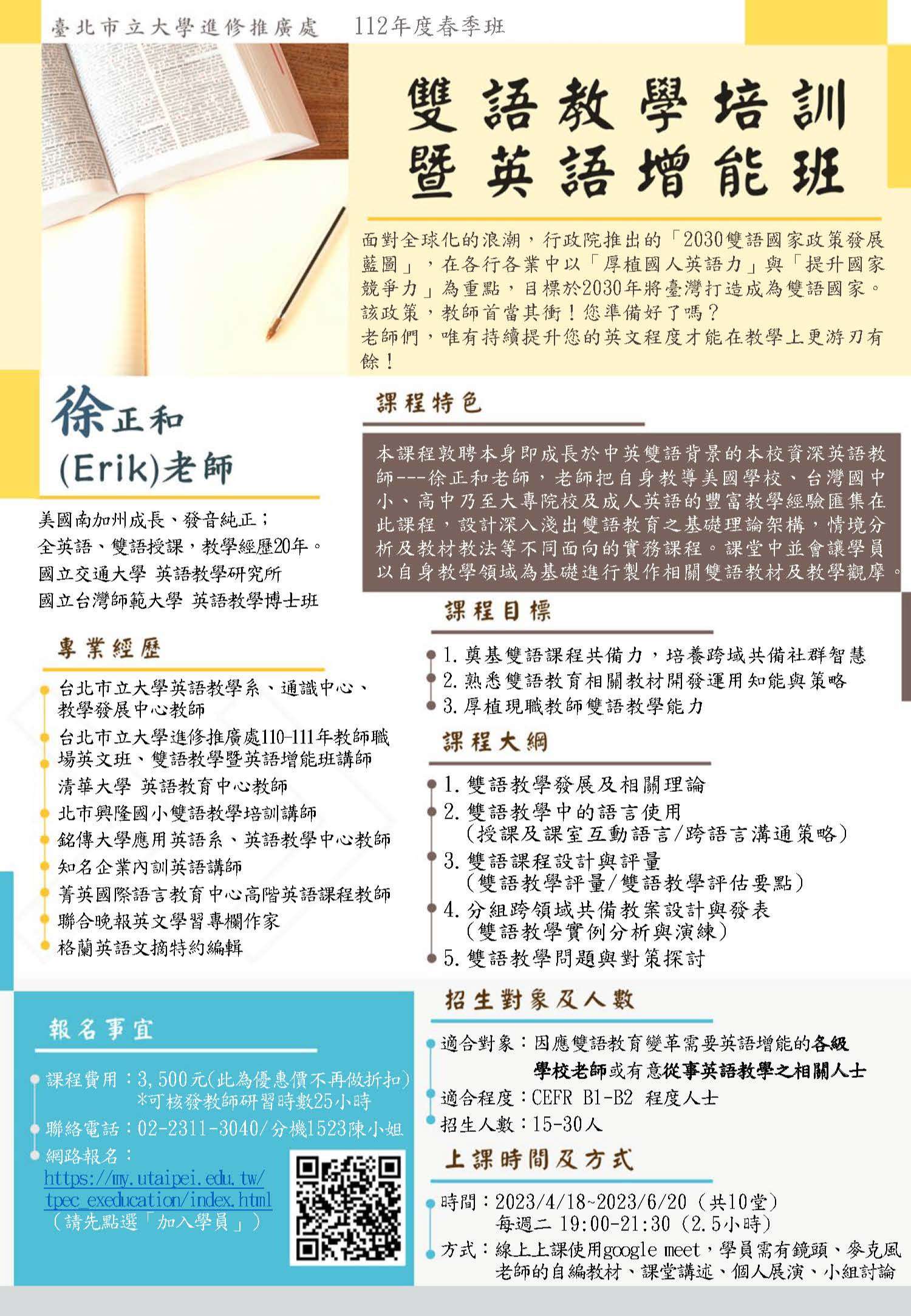 (七)網路報名:請至本處報名網頁報名(https://my. utaipei.edu.tw/tpec_exeducation/index.html)新學員 請先於右上角「加入學員」,再於左欄點選「112春-成 人進修-雙語教學培訓暨英語增能班」。