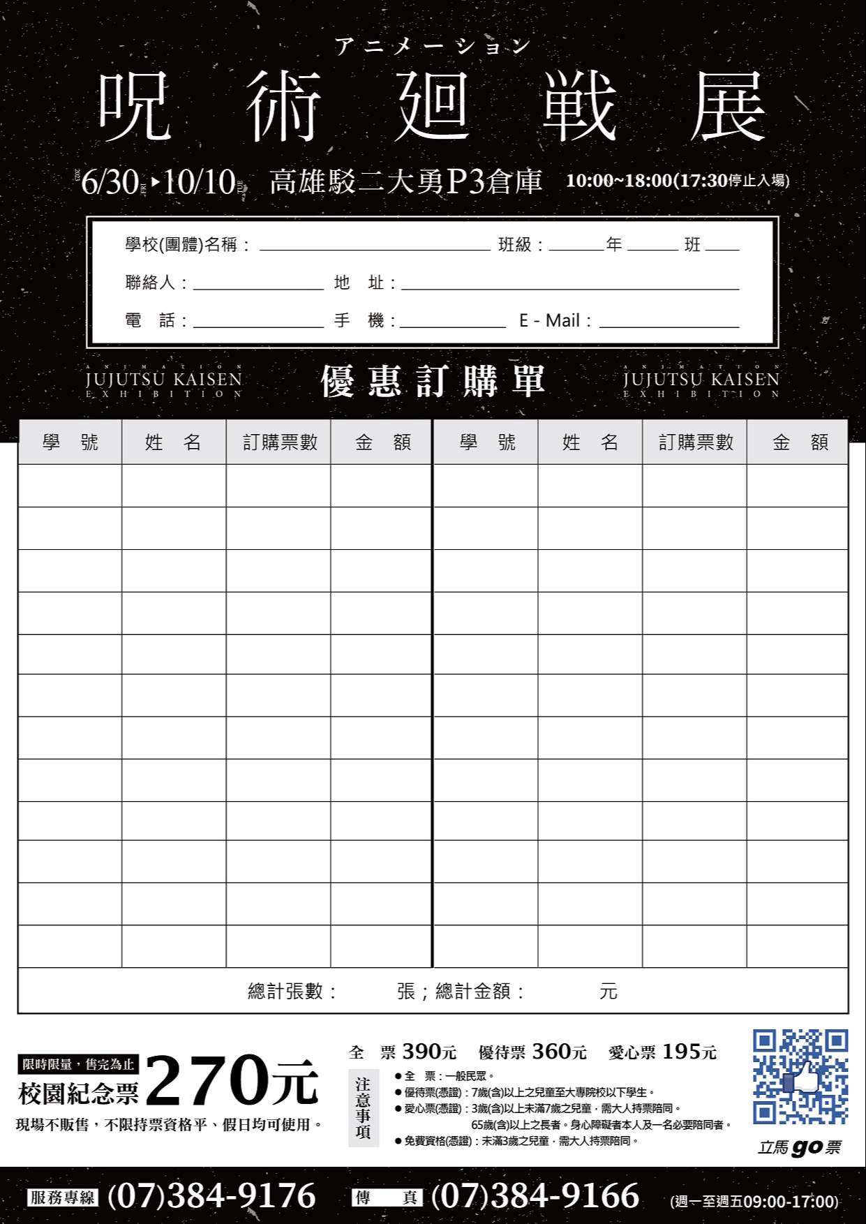 一、為充實國人文化藝術視野、推廣動畫教育、增進國際教育 的深度與廣度,本公司特引進日本超人氣漫畫「咒術迴 戰」展覽。「咒術迴戰」自2020年改編動畫後引爆全球熱 潮,成為現象級動畫大作,於日本巡迴展內容分兩期展 出,本次「咒術迴戰展」海外特展集結所有作品,一次完 整呈現給台灣觀眾,期待透過包含數百幅原畫、分鏡圖、 等身FRP、巨型動畫投影及名場還原等豐富展品,一窺圖像 授權產業成功背後的密訣!