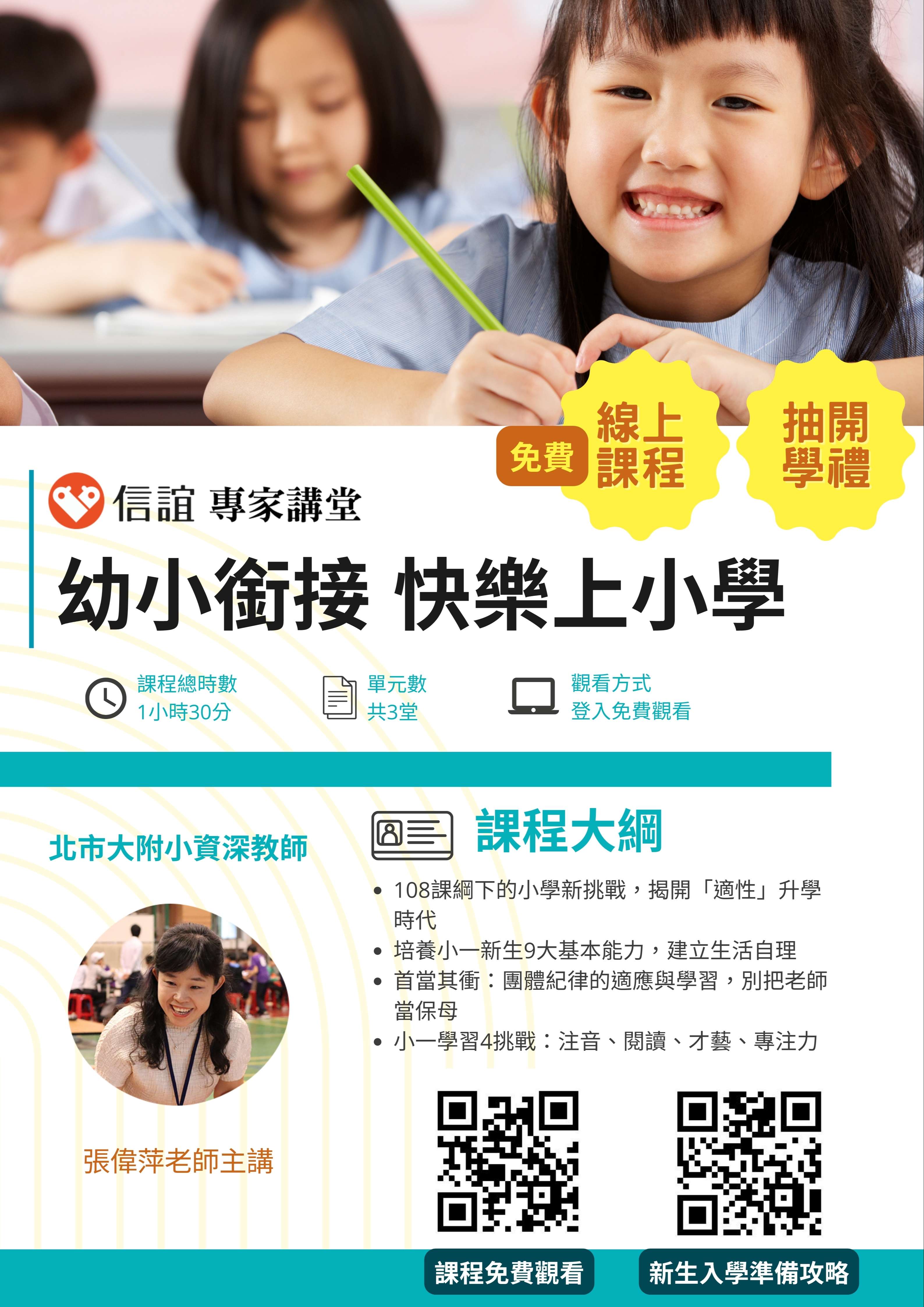 一、為幫助今年即將升小一的孩子順利銜接小學生活,信誼基 金會提供線上課程「做好幼小銜接 快樂上小學」讓新生家 長免費觀看,由北市大附小資深教師張偉萍主講,透過3堂 課程帶爸媽認識小學世界,陪伴孩子上小學。三堂課主題 如下:
