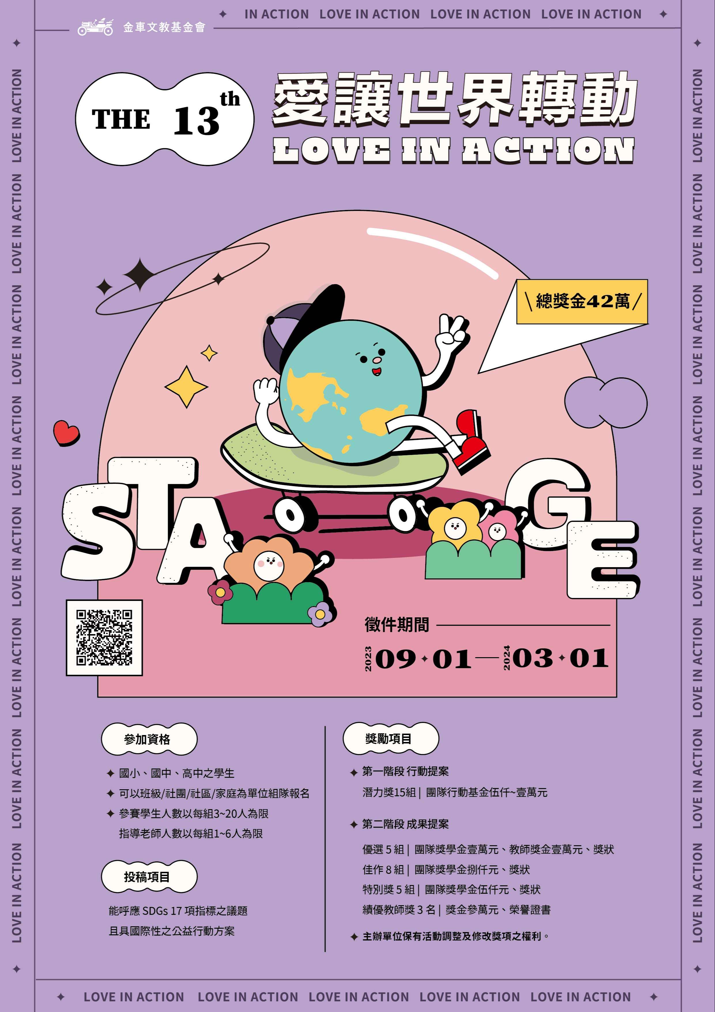一、本會自2011年開始舉辦「愛讓世界轉動 兒少公益行動」徵 選,以STAGE行動步驟為基礎,從發現問題、創意思考、行 動實踐到收穫反思,鼓勵青年學子以國際視野落實在地行 動,培育下個世代成為具備同理心、行動力及團隊溝通力 之世界公民。 二、第13屆「愛讓世界轉動 兒少公益行動」徵選資訊