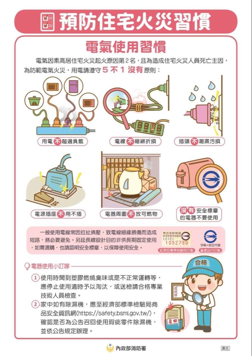 四、用電牢記「5不1沒有」:1.「用電『不』超過負載」2.「電線『不』綑綁折損」3.「插頭『不』潮濕污損」4.「電源插座不用『不』插」5.「電器周圍『不』放可燃物」6.「『沒有』商品安全標章的電器不用」,以確保居家安全。