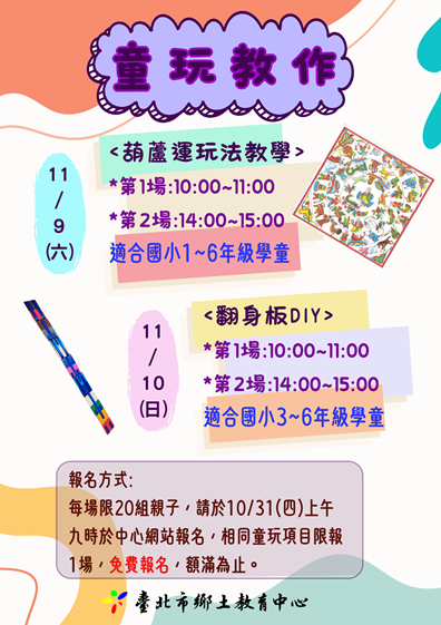 二、為達到寓教於樂、認識傳統童玩的目的,鄉土教育中心特 辦理「113年童玩教作」活動,以活絡中心教育推廣功 能。