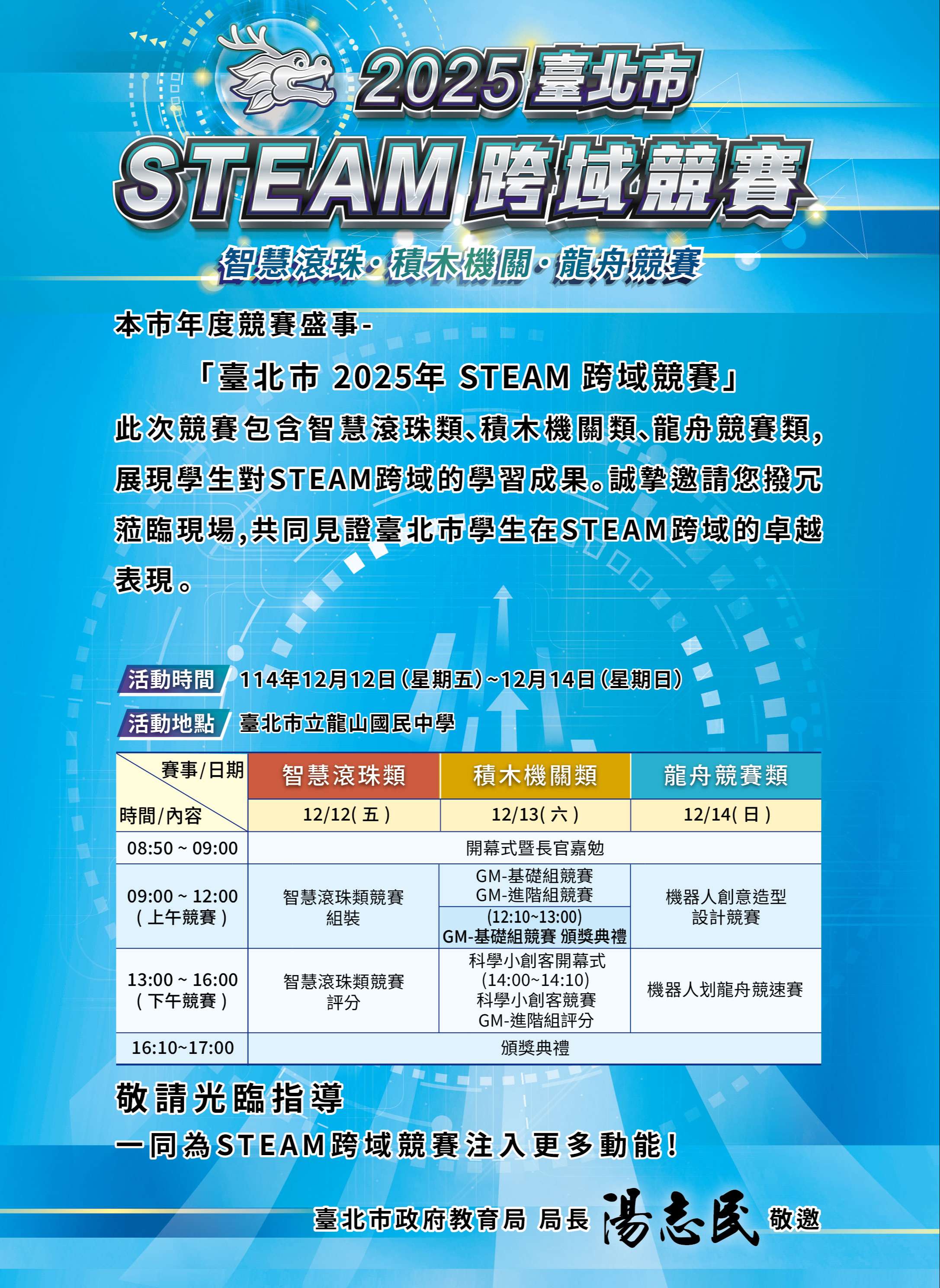 龍山國民中學將於114年12月12日(星期五)至12月14日(星期日)辦理 「臺北市2025年STEAM跨域競賽」暨頒獎典禮。